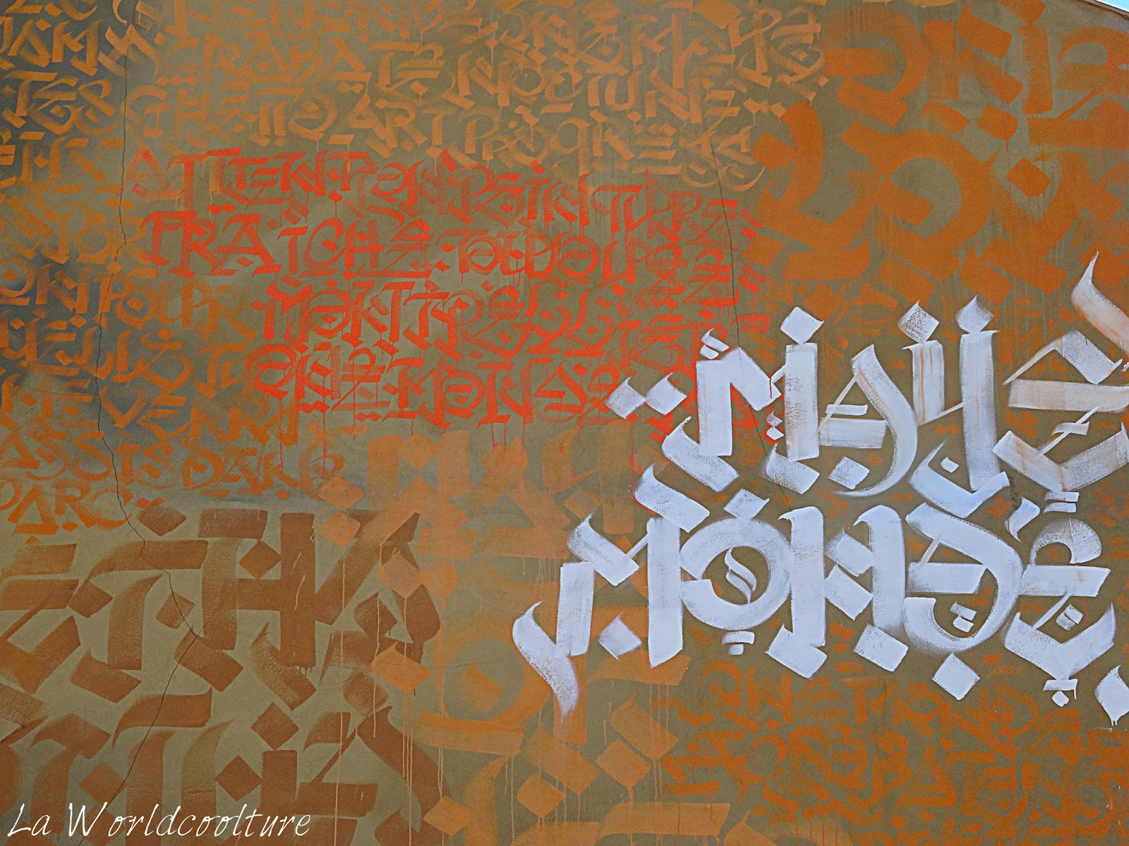 Monde a, quant à lui, réalisé le fond : les lettres calligraphiées qui seraient les paroles d’une chanson de rap. As-tu vu le détail « Attention peinture fraîche » ? Mais siiiii ! Là ! En rouge :